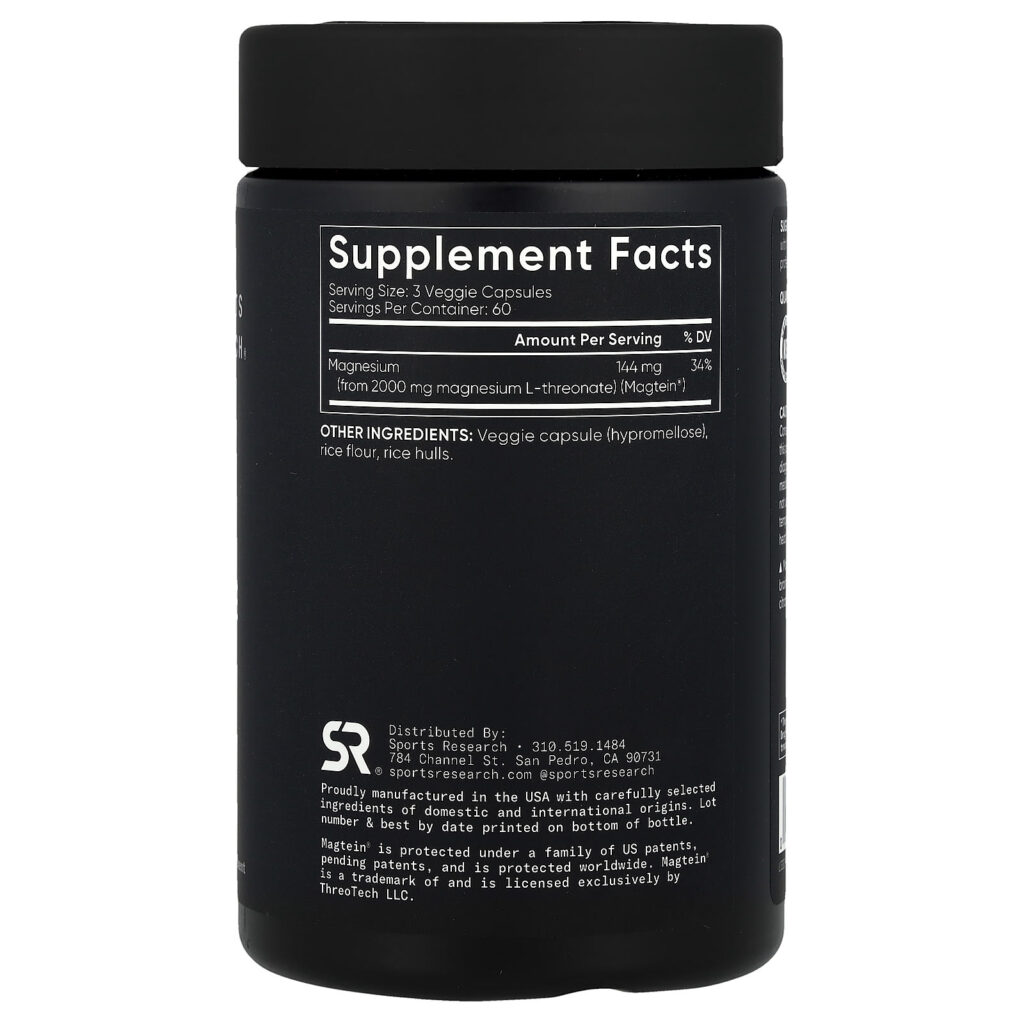 Sports Research Magtein® Magnesium L-Threonate 180 Cápsulas Vegetais (666 mg por Cápsula) – Sports Research Suplementos Minerais Magnésio L-Treonato de Magnésio.
