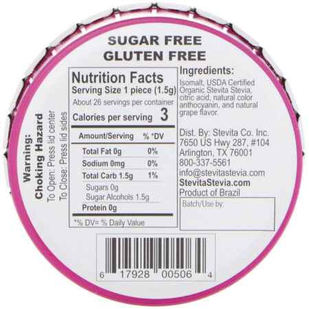 Isomalt, Stevita stevia orgânica certificada pela USDA, ácido cítrico, antocianina natural e sabor natural da uva.