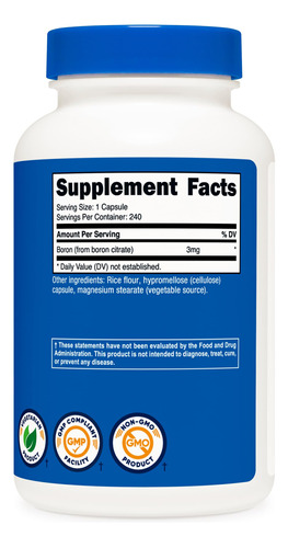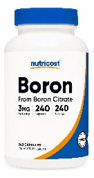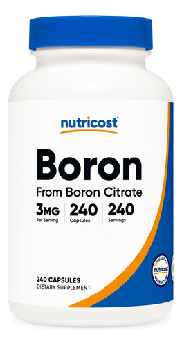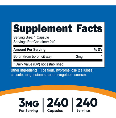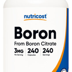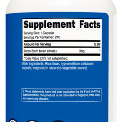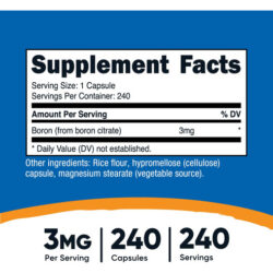 – As cápsulas de boro de 3 mg da Nutricost contêm 240 cápsulas vegetarianas de boro em cada frasco para 240 porções.
