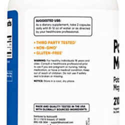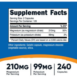 210 mg de magnésio (a partir de citrato de magnésio) por porção 99 mg de potássio (de citrato de potássio) por porção 240 cápsulas, 120 porções em cada frasco. Não transgênico, sem glúten, sem soja e testado por terceiros. Feito em uma instalação registrada pela FDA e compatível com GMP. 210 mg de magnésio (a partir de citrato de magnésio) por porção 99 mg de potássio (de citrato de potássio) por porção 240 cápsulas, 120 porções em cada Garrafa não transgênica, sem glúten, sem soja e testada por terceiros, feita em uma instalação compatível com GMP e registrada pela FDA.