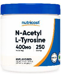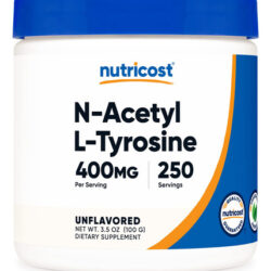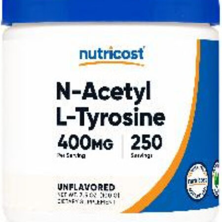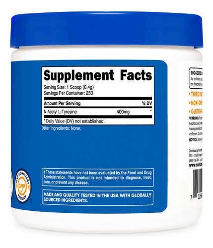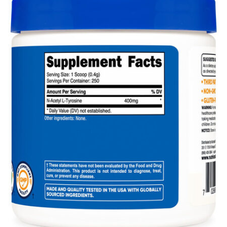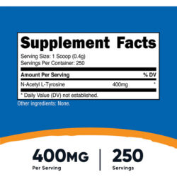 400 mg de N-acetil L-tirosina por porção (250 porções) – Não transgênico, sem glúten – Fabricado em uma instalação registrada pela FDA e compatível com GMP
