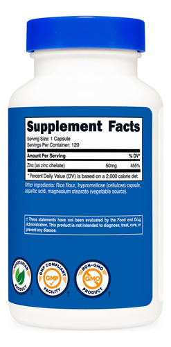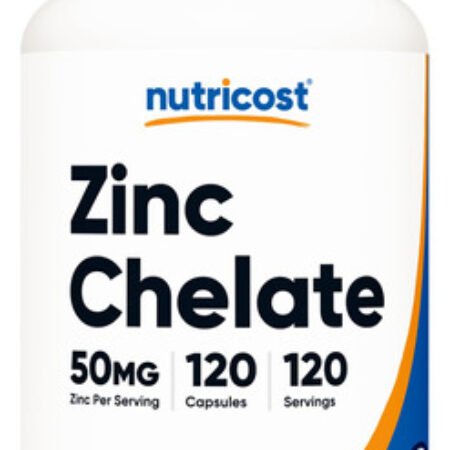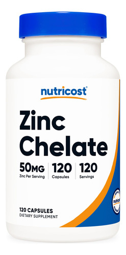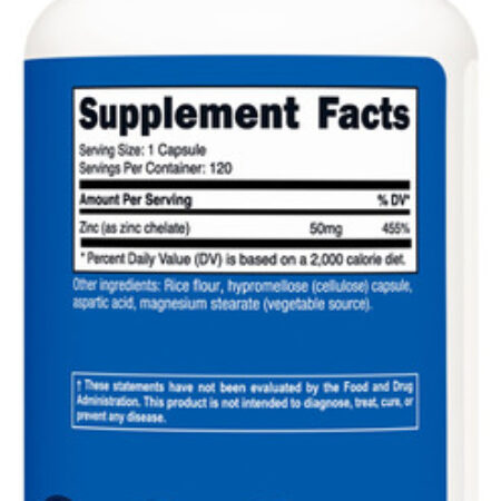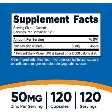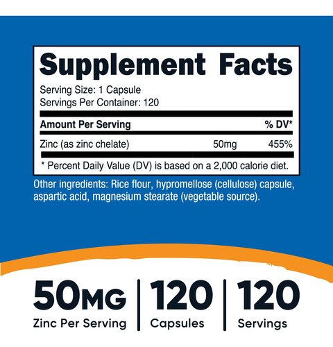 O quelato de zinco da Nutricost fornece 50 mg de zinco em cada porção. Existem 120 cápsulas em cada frasco para 120 porções (1 porção, apenas 1 cápsula).
