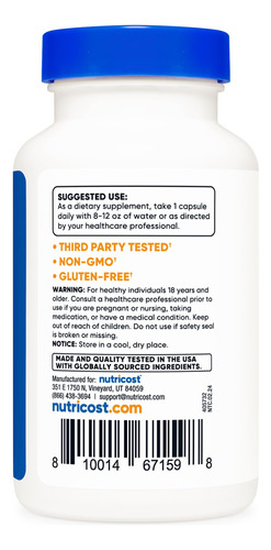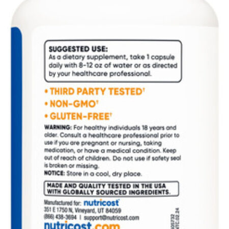 O quelato de zinco Nutricost é adequado para vegetarianos, não transgênico, sem glúten e testado por terceiros.