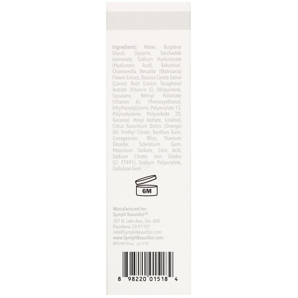 Água, Butilenoglicol, Glicerina, Isomerato de Sacarídeo, Hialuronato de Sódio (Ácido Hialurônico), Bakuchiol, Extrato da Flor de Chamomilla recutita (Matricária), Extrato da Raiz de Daucus carota sativa (Cenoura), Acetato de Tocoferol (Vitamina E), Ubiquinona, Esqualano, Palmitato de Retinol (Vitamina A), Fenoxietanol, Etilhexilglicerina, Poliacrilato-13, Poliisobuteno, Polissorbato 20, Geraniol, Acetato de Hexilo, Linalol, Óleo de Citrus Aurantium dulcis (Laranja), Citrato de Trietilo, Goma Xantana, Carragenina, Mica, Dióxido de Titânio, Goma Esclerótica, Sorbato de Potássio, Ácido Cítrico, Citrato de Sódio, Óxidos de Ferro (CI77491), Poliacrilato de Sódio, Carmelose Sódica.