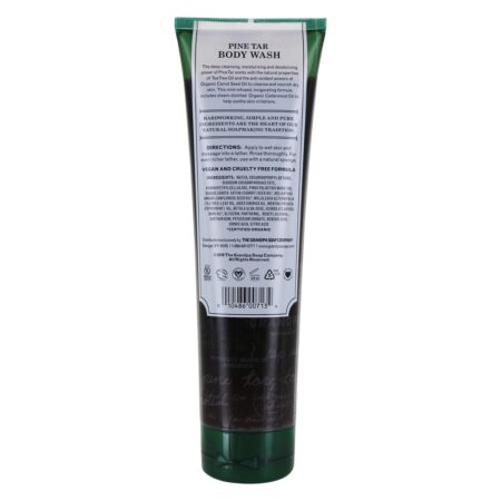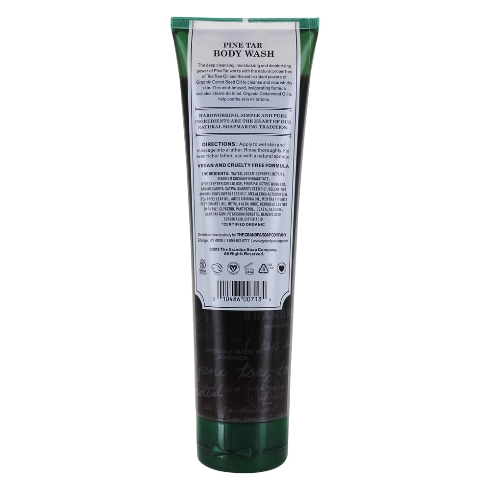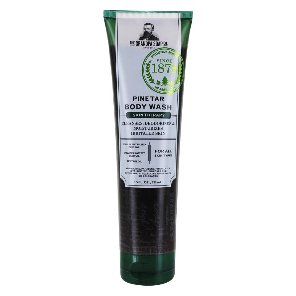 O Vovô Soap Co. melhorou a fórmula de sua lavagem de corpo de alcatrão de pinho 100 % baseada em plantas. Agora, com as propriedades naturais do óleo da árvore do chá e os poderes anti-oxidantes do óleo de semente de cenoura orgânica. Limpa, desodoriza e hidrata a pele irritada.