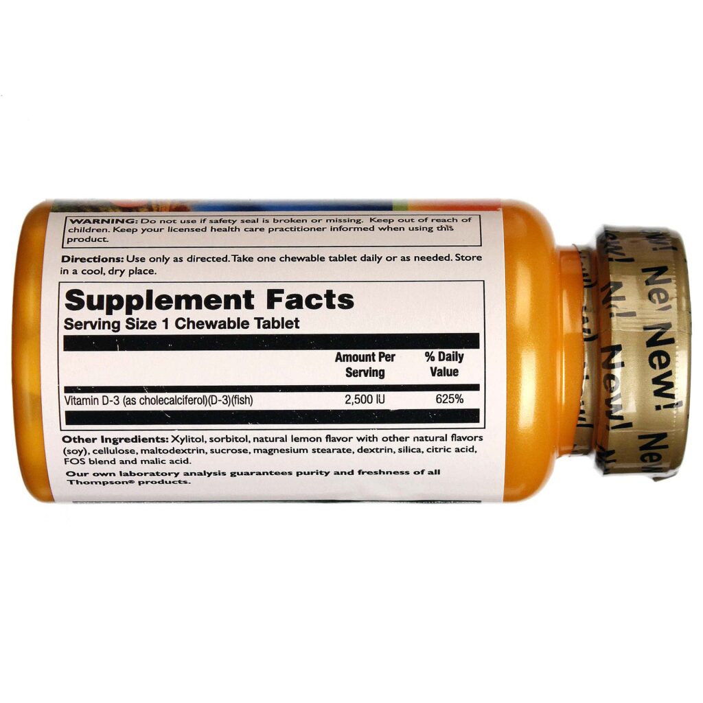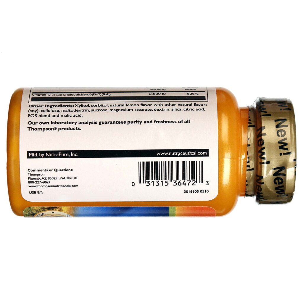 A Vitamina D3 Thompson é um suplemento alimentar em comprimidos mastigáveis com sabor de limão, que fornece 2.500 UI de Colecalciferol por dose, auxiliando na saúde óssea, imunidade e bem-estar geral.