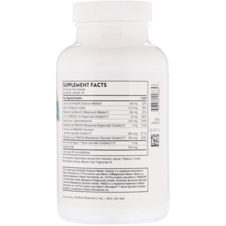 As deficiências minerais são geralmente encontradas em idosos, em crianças e adolescentes e em pessoas com distúrbios alimentares ou doenças crônicas. Tomar certos medicamentos prescritos também pode resultar em deficiência mineral. Ao formular o Biomins II, Thorne concluiu que o malato bicálcico e o dimagnésio malato (duas moléculas de cada mineral ligadas a uma molécula de malato) são as formas de cálcio e magnésio para otimizar a absorção e a concentração (o quanto cabe em uma cápsula). O Albion Laboratories, um inovador em quelatos minerais desde 1956, fornece a maioria dos minerais em nossa fórmula BioMins II. Acreditamos que os quelatos glicinatos da Albion (zinco, cromo, manganês, molibdênio e boro) mostram excelente absorção e tolerabilidade.
