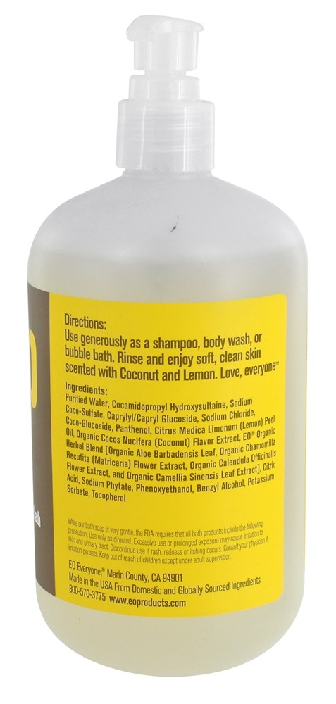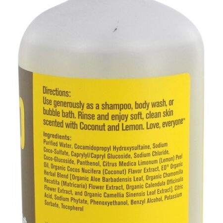 EO Products Todo o mundo 3 em 1 Sabão Coco + Limão é um múltiplas-tasking sabão é formulado para ser usado como xampu, corpo lavar, e bolha banho. Misturado com coco de luxo, o óleo essencial de limão brilhante desperta a pele e transporta os sentidos. Limpadores suaves e extratos botânicos criam uma espuma espumosa e nutritiva para a pele.