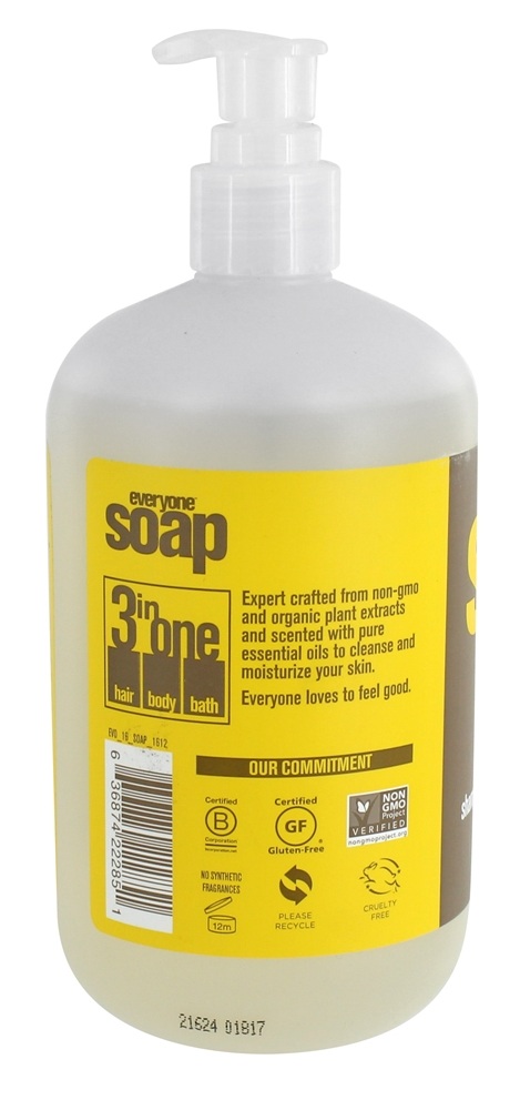Todos os outros produtos EO e Everyone são completamente veganos e nenhum dos seus produtos é testado em animais. Todos os testes, pesquisas, desenvolvimento e fabricação são feitos em um laboratório somente humano em suas instalações em Marin County, CA. EO Products , criadora das marcas EO e Everyone, é uma empresa certificada em verde, uma certificada B-Corporation e a primeira empresa certificada de cuidados corporais que não são transgênicos. Os produtos EO e Everyone também são certificados sem glúten. Além disso, são completamente biodegradáveis e com pH balanceado. Eles têm fabricado produtos de cuidados com o corpo de luxo premium por 20 anos usando apenas os melhores ingredientes naturais. Embora nem todos os produtos sejam orgânicos, eles optam por ingredientes orgânicos e selvagens sempre que possível, e são um fabricante orgânico certificado.