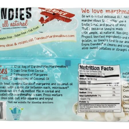 Dandies Todos Natural Mini- Marshmallows foram criado fora de amor para marshmallows! Eles criaram todos os marshmallows naturais que oferecem aos clientes um tratamento personalizado e paz de espírito. Isso é porque eles são feitos com ingredientes simples, todos naturais, não transgênico e sem gelatina, então eles são parentes de amigos animais também. Dandies Marshmallows são perfeitos para assar sobre a fogueira, para guloseimas crocantes clássicas ou para fazer s’mores.