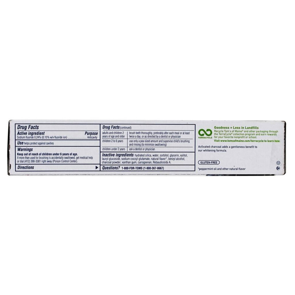 Além do carvão ativado, o creme dental utiliza óleo de hortelã-pimenta natural para proporcionar frescor. A Tom’s of Maine se esforça para incluir ingredientes derivados de fontes naturais e vegetais em suas formulações, evitando corantes, adoçantes e conservantes artificiais.