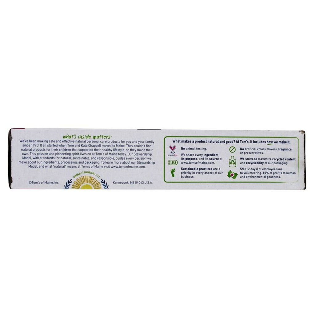 - Sem Testes em Animais (Cruelty-Free): A Tom’s of Maine é comprometida com práticas éticas e não realiza testes em animais.