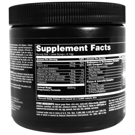 Dosagem: Para criar uma "dose" concentrada de Animal Rage XL, misture 1 colher medidora com 120 ml da sua bebida preferida 20 a 30 minutos antes de uma atividade intensa. Devido à extraordinária potência de Animal Rage XL, é aconselhável começar com uma colher medidora para avaliar a tolerância individual. Não consumir mais do que duas doses em um período de 24 horas ou no intervalo de 6,8 horas antes de dormir.