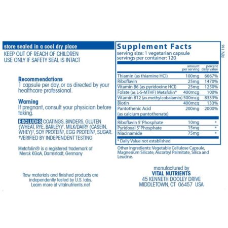 Vital Nutrients B-Complex é um suplemento alimentar formulado com um conjunto de vitaminas do complexo B. Ele serve para apoiar o metabolismo energético, a função do sistema nervoso, a saúde celular e diversas outras funções bioquímicas essenciais para o bem-estar geral.