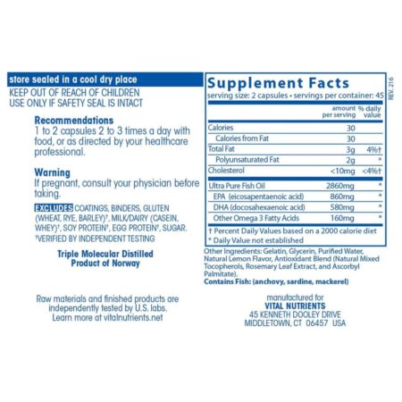 Óleo de Peixe Vital Nutrients Ultra Puro 800 Limão: O Poder do Ômega-3 para Sua Saúde Cardiovascular e Cerebral com 90 Cápsulas Gel