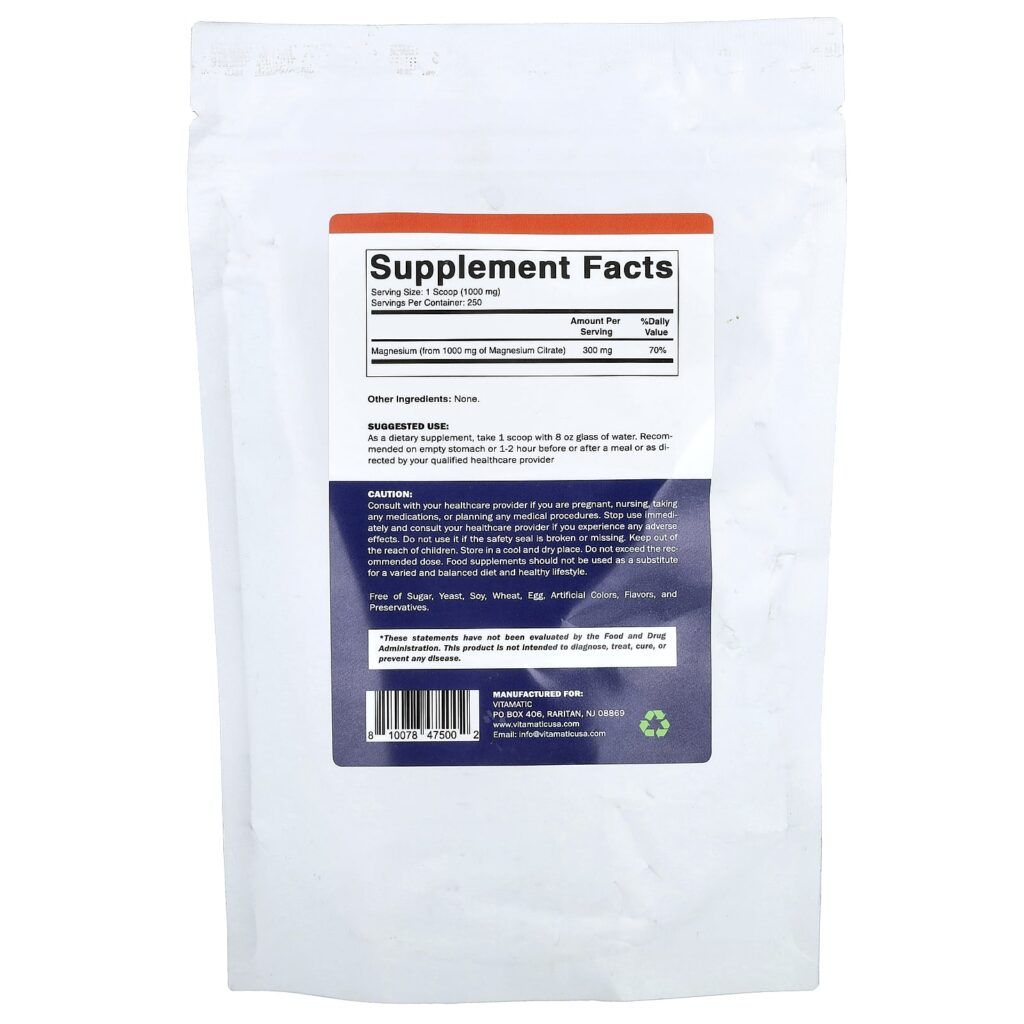 Vitamatic Citrato de Magnésio em Pó 250 g (88 oz) – Vitamatic Suplementos Minerais Magnésio Citrato de Magnésio.