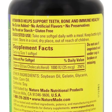Nature Made Vitamina D3 1000 UI cápsulas de gel líquido são feitas de vitamina D3, a forma preferida do corpo de vitamina D. A manutenção de níveis saudáveis de vitamina D no seu corpo foi demonstrado ser um parte importante da saúde geral. A vitamina D3 ajuda a suportar dentes, ossos e saúde imunológica. Nature Made vitamina D3 1000 IU é garantida para atender seus altos padrões de qualidade – é feita a partir de ingredientes cuidadosamente selecionados em processos de fabricação rigorosos.