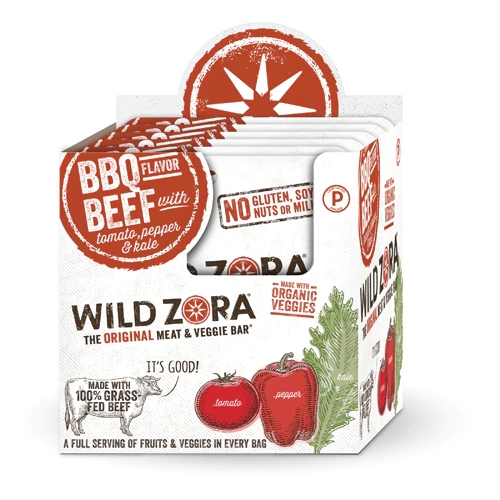 Wild Zora Barra de Carne e Vegetais BBQ Beef com Tomate, Pimentão e Couve 28g – Pacote com 10 Unidades
